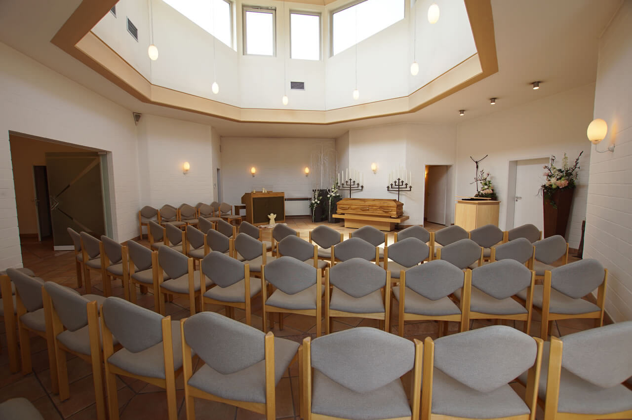 Unsere hauseigene Kapelle in Gerresheim bietet eine angenehme Atmosphäre und die Möglichkeit, den Abschied ganz individuell zu gestalten. Wir sind losgelöst von strengen Vorgaben und Zeiten der städtischen Friedhöfe. In der Umsetzung sind uns kaum Grenzen gesetzt. Erzählen Sie uns etwas Persönliches über Ihren lieben Verstorbenen, damit wir die Trauerfeier für bis zu 100 Personen (60 Sitzplätze) entsprechend ausrichten können.