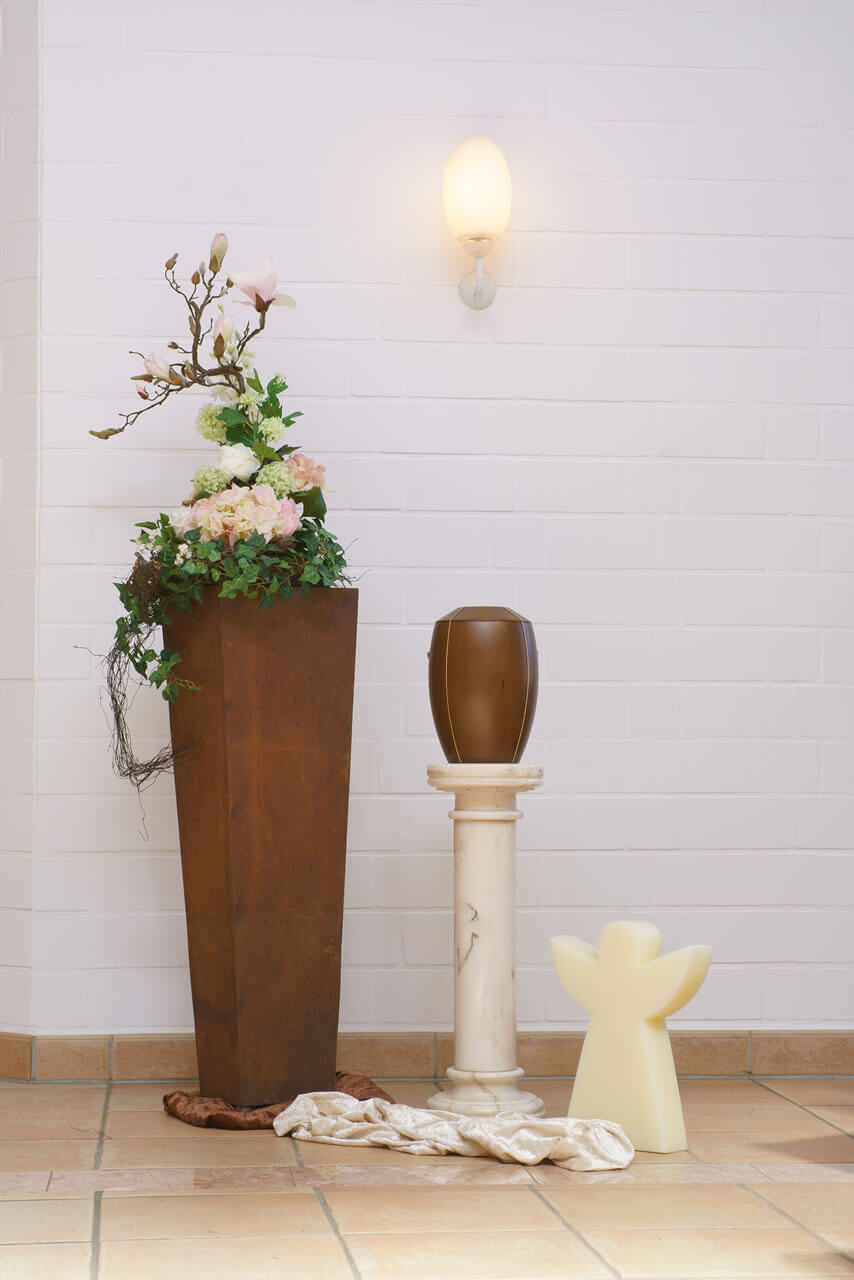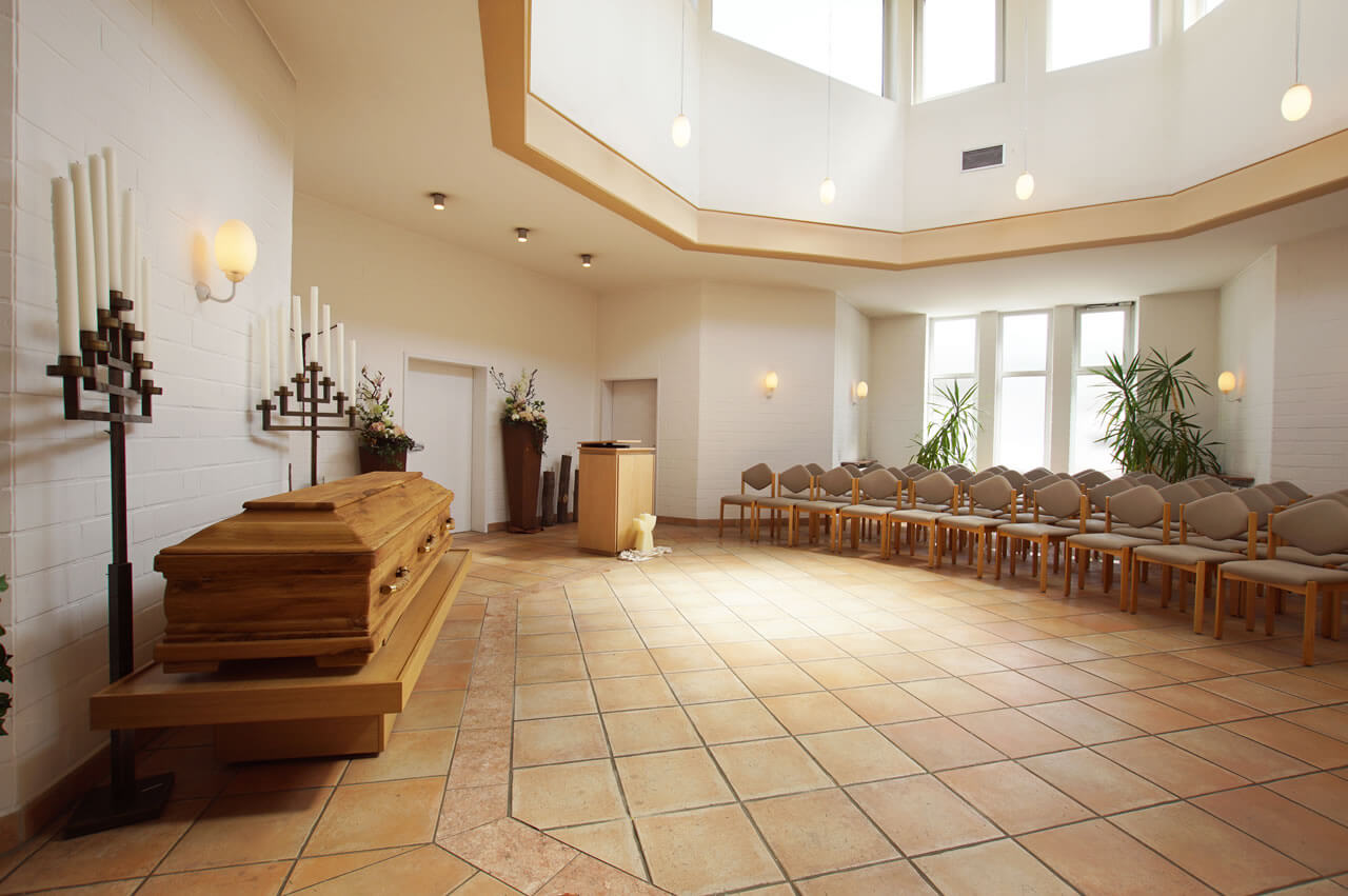 • Warme Farbtöne fangen die Emotionen sanft auf – wir bieten Angehörigen und Trauergästen einen schutzvollen Rahmen, um Abschied zu nehmen.