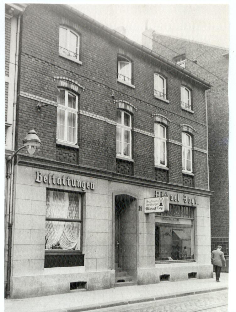 1887 von Franz Vogt als Schreinerei gegründet, werden im Jahr 1896 die Geschäftsräume Am Kölner Tor in Gerresheim eröffnet. 1928 wird das Unternehmen dann von Michael und Helene Vogt als reines Bestattungsunternehmen weitergeführt. Die Filiale in Flingern, Birkenstraße 99, kommt hinzu.